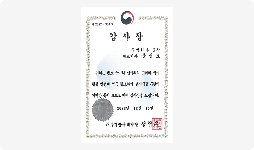 Received Letter of Appreciation from Commissioner of Daegu Regional Tax Office